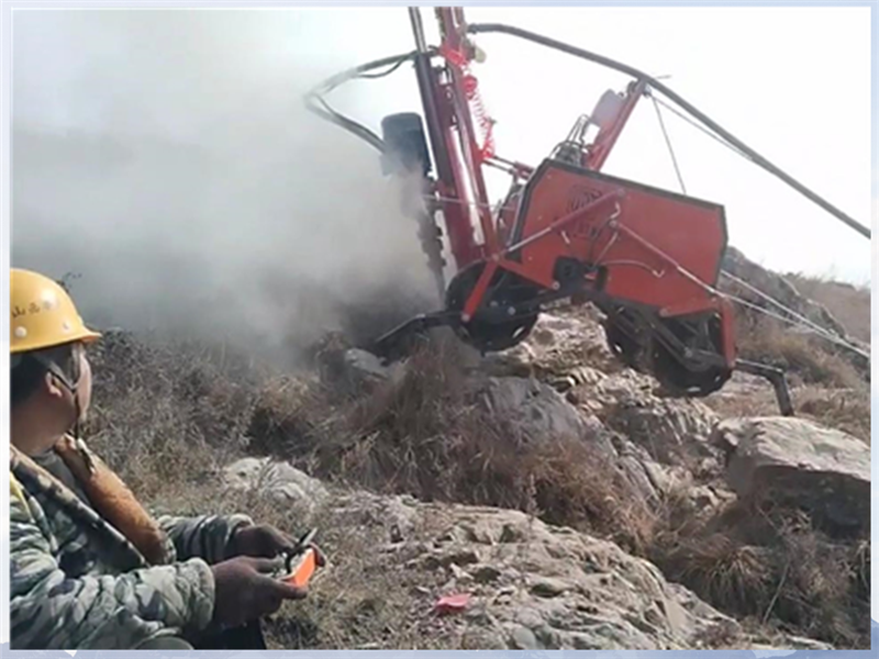 作业前,操作人员需对恒睿遥控爬坡钻机进行全面检查,确认设备遥控信号稳定、钻臂俯仰调节灵活,同时排查坡面30米范围内无浮石、障碍物,确保工况符合肉眼可视、无需换钻杆的作业要求。作业过程中,依托恒睿遥控爬坡钻机的全地形自适应四轮驱动性能,设备可稳定停靠坡面,90°俯仰可调的钻臂精确把控钻孔角度,操作人员通过遥控终端实时监控钻孔进度,无需现场值守,既保障了人员安全,又提升了作业便捷度。