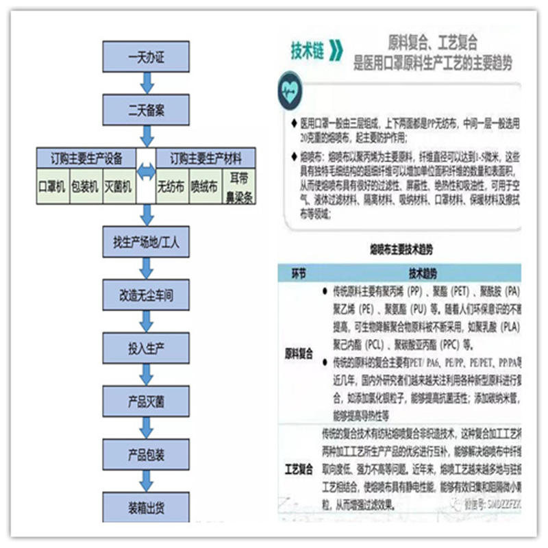 一:是作为医疗器械管理的口罩,如:医用防护口罩、一次性普通医用口罩;医用外科口罩,目前医用口罩主要是这三种。生产此类产品,需要向省级食品药品监督管理局器械处申请办理“医疗器械产品注册证”、“医疗器械生产许可证”,目前均需要10万级以上的洁净车间,并具备微生物试验能力和相关理化试验能力。