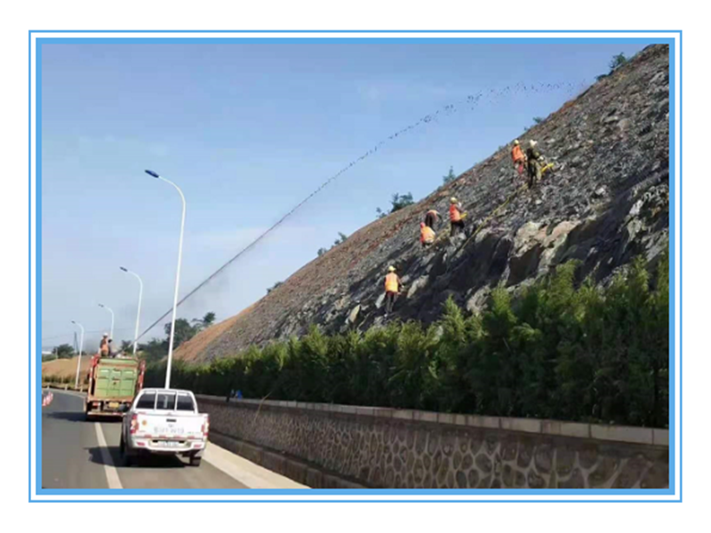 工序流程:坡面清理→局部地形修整→铺网→锚钉加固→基质材料喷播→植物种子及营养层的喷播→覆盖→养护管理注意事项:将过筛腐殖土、木纤维、泥炭土、缓释营养肥、粘合剂、保水剂、水等混合材料用喷播机充分搅拌,然后通过喷播机将材料及种子送至坡面,喷附到预先固定在坡体上的铁丝网上。
