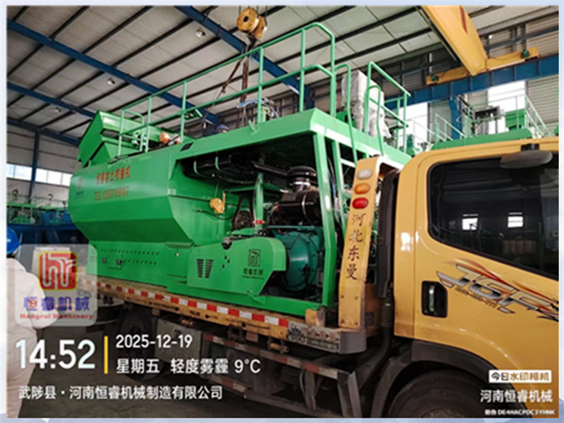 从动力配置看,该恒睿喷播机采用 309kW(420 马力)国六柴油动力,搭配 40kW 搅拌辅助电机,既能保障远距离大面积喷播的动力需求,也能通过喷枪 + 导管的组合模式,兼顾精确作业场景。此次发货的恒睿喷播机净重达 5000kg,外形适配工程运输标准,可快速投入现场施工。